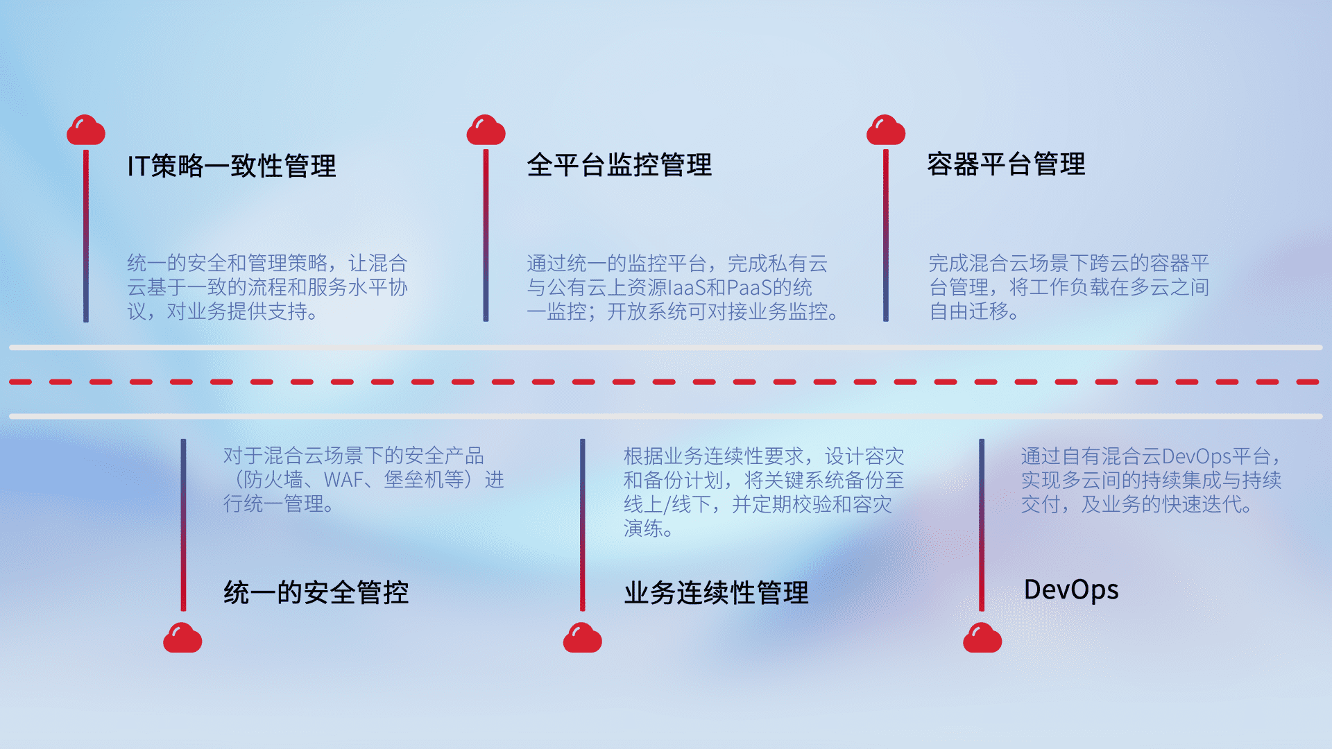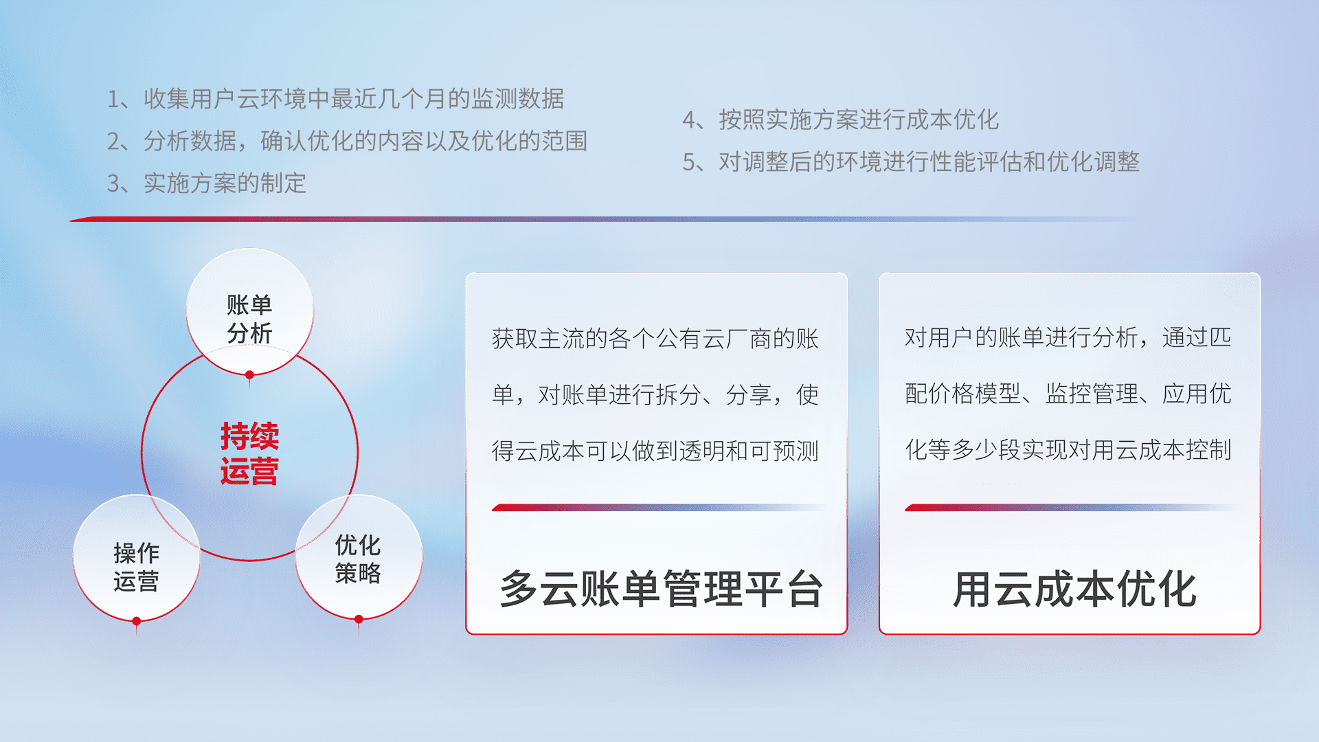 通过多云纳管,,,以统一的资源数据模型把客户的云资源进行抽象和封装,,进而实现对多云资源的统一操作,,,保障云资源管理的可靠性、、、稳定性与可用性。。。。量身定制化运维内容,,,配置、、、、开发运维、、、补丁管理、、、备份、、、、监控、、认证和访问管理、、、审计和日常巡检等,,保障在用云过程中的可靠度,,,,稳定度以及高可用率。。