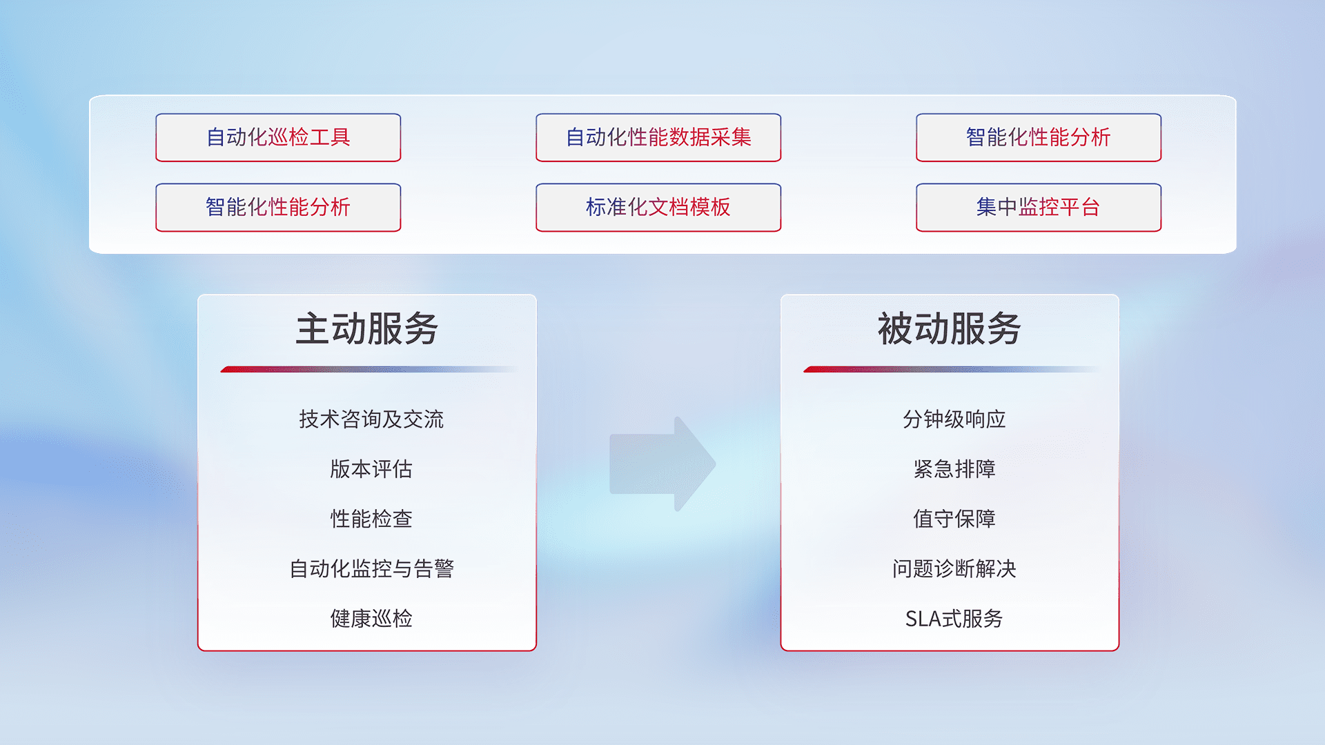 智能化工具和标准化文档,,,保障服务质量,,,提供主动服务(包含技术咨询、、、、版本评估、、、性能检查、、、自动化监控与告警、、、健康巡检)和被动服务包含(分钟级响应、、紧急排障、、、值守保障、、、、问题诊断解决、、SLA服务)。。。